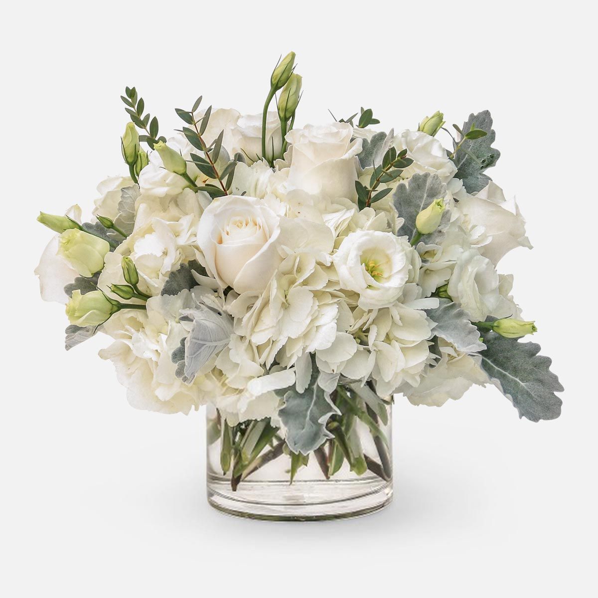 Our designers have curated a “captivating” array of white-on-white textures to create a “unique color harmony” that is anything but simple. The velvety petals of the white roses offer a “clean and refined” focal point, while the lisianthus adds a touch of “modern charm” with its slender stems and intricate buds. To add a “serene beauty” to the arrangement, we include Dusty Miller, known for its silvery, felt-like foliage, and fresh seasonal greens for a “garden-fresh” contrast. Presented in a sleek glass vase, the Alabaster Whisper Bouquet is an “effortlessly elegant statement” of calm and grace, showcasing “sophisticated taste” through its minimalist and high-end design.