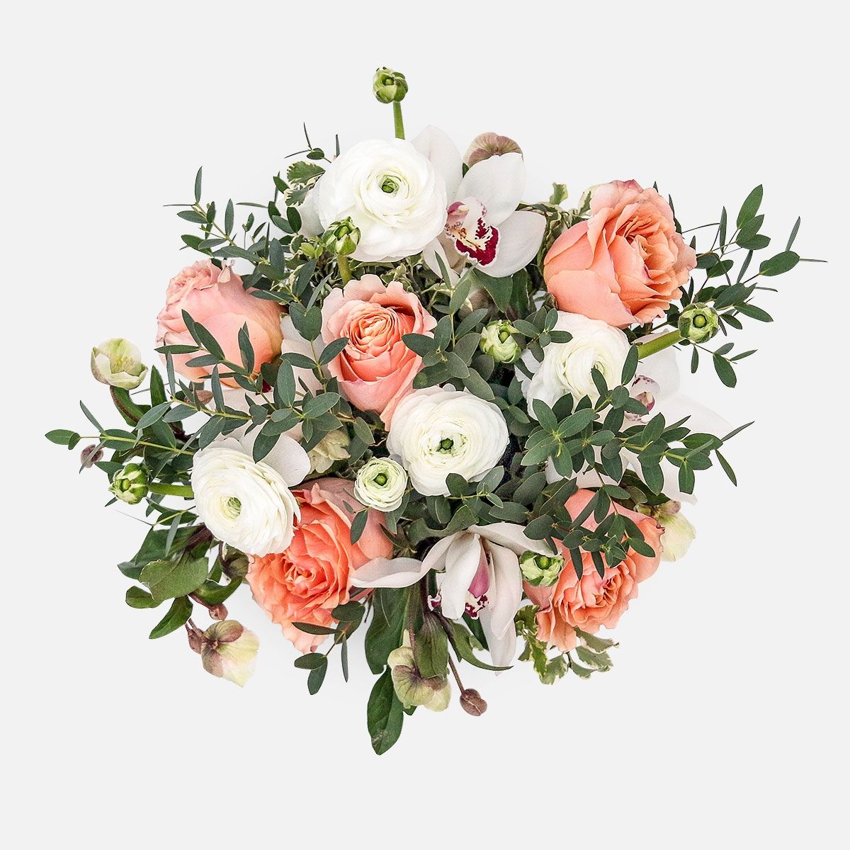 The star of this display is the premium peach rose, which radiates a soft, friendly warmth and represents sincerity and gratitude. To create a modern and high-end contrast, these glowing roses are nestled alongside the cool, neutral tones of ivory ranunculus, delicate hellebore, and exotic cymbidium orchids. The ranunculus adds a layer of intricate, ruffled detail, while the orchids provide a touch of tropical luxury and exceptional longevity. To bring the “garden” to life, we incorporate fragrant eucalyptus and a variety of seasonal greens. These elements provide a soft, airy texture and a lush fullness, ensuring the arrangement feels abundant and “just-picked.” The natural scent of the eucalyptus adds a refreshing, therapeutic dimension to this already pleasant display.
