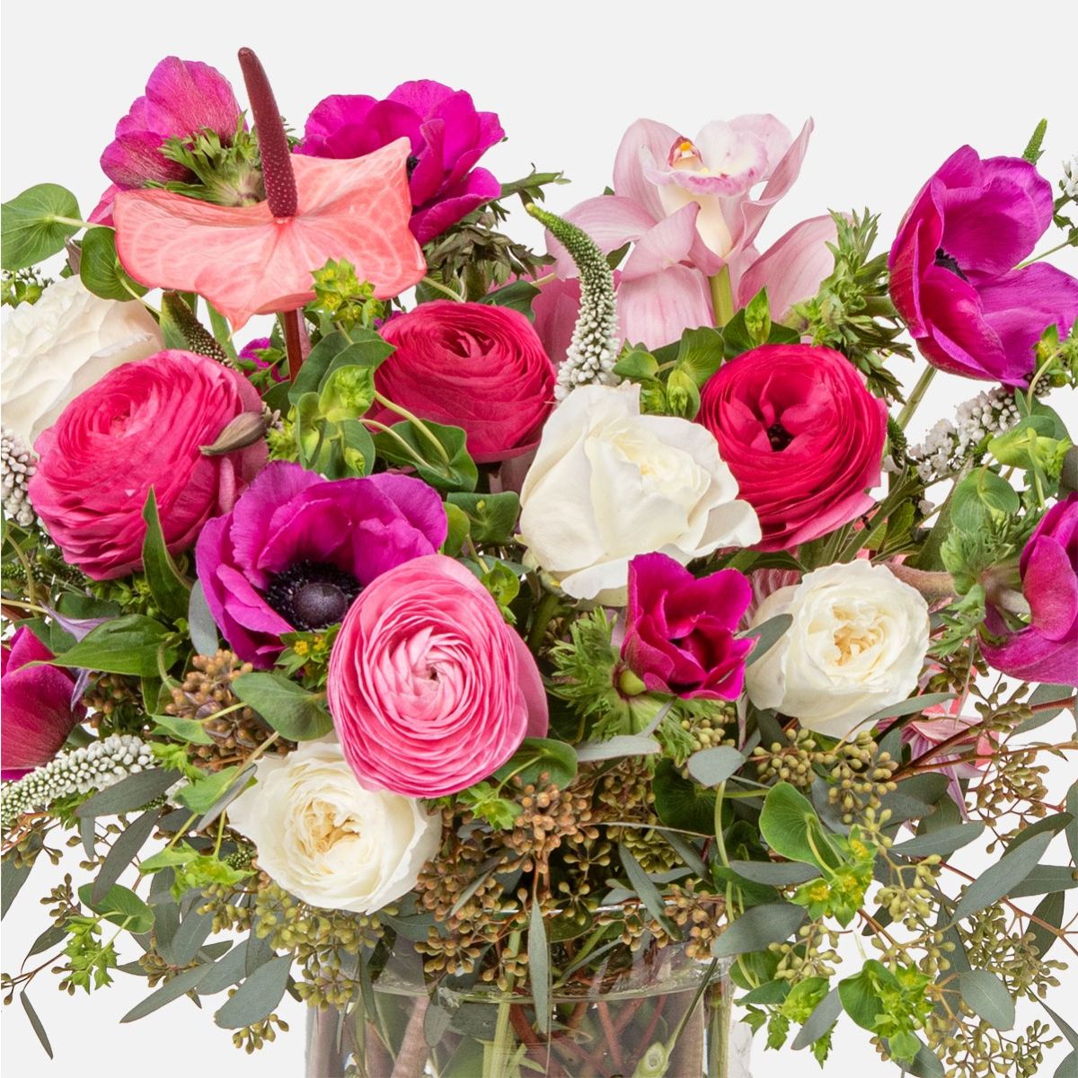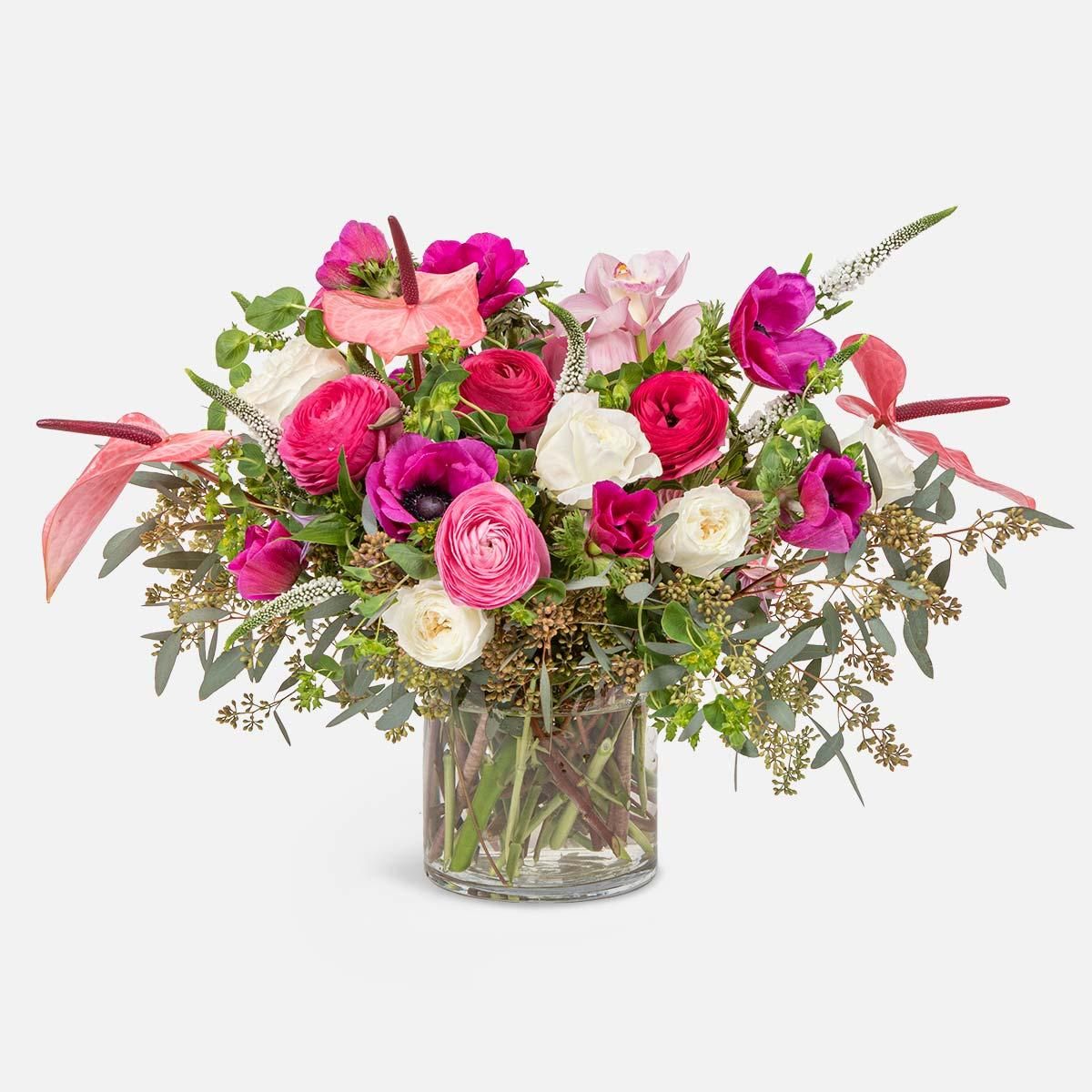 Artfully accented with striking pink anthuriums, graceful clematis, and elegant cymbidium orchids, this arrangement creates a captivating display of texture, color, and modern romance. Designed to make a statement, it serves as a breathtaking centerpiece for weddings, anniversaries, or any occasion deserving of extraordinary beauty.