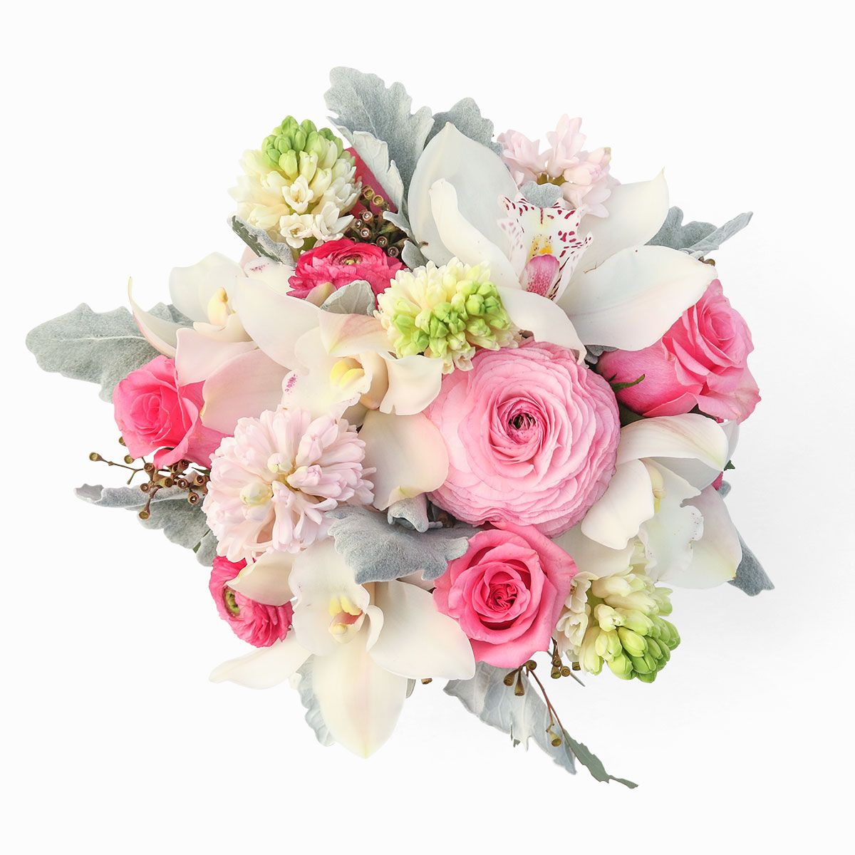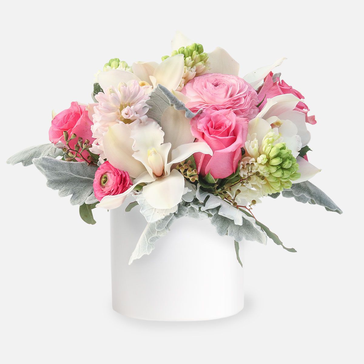 The Petite Romance Bouquet features a sophisticated interplay of premium blooms. At its heart are pristine white cymbidium orchids, lending a touch of exotic luxury and lasting beauty. These are paired with the ruffled elegance of lush pink ranunculus and the timeless grace of soft pink roses. To heighten the sensory experience, we’ve included fragrant white hyacinths, which fill the air with a delicate, spring-like perfume. The arrangement is presented in a sleek white ceramic vase, providing a modern, clean finish that allows the pink and white tones to shine. Measuring 10–11 inches tall with an 8-inch diameter, it is perfectly sized for an office desk, a bedside table, or as a charming breakfast-in-bed surprise.
