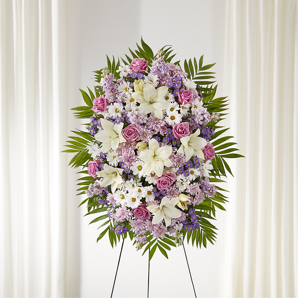 Wrap them in a beautiful hug during a time of need with a warm and inviting standing spray. This spray is artfully designed with white and lavender blooms, making a gorgeous accent to a loved one’s service.