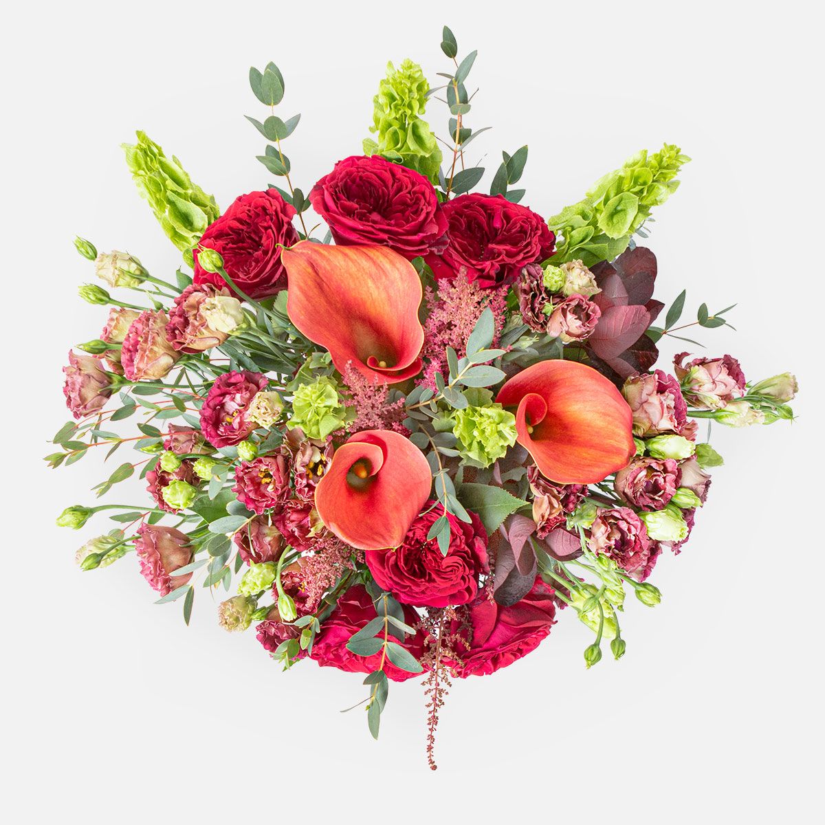 Celebrate warmth and affection with the “Love & Happiness” bouquet, a stunning arrangement that artfully blends rich, earthy tones for a bold yet elegant statement. This eye-catching design pairs deep red garden roses with vibrant orange calla lilies, accented by the unique beauty of brown lisianthus and textured Bells of Ireland.